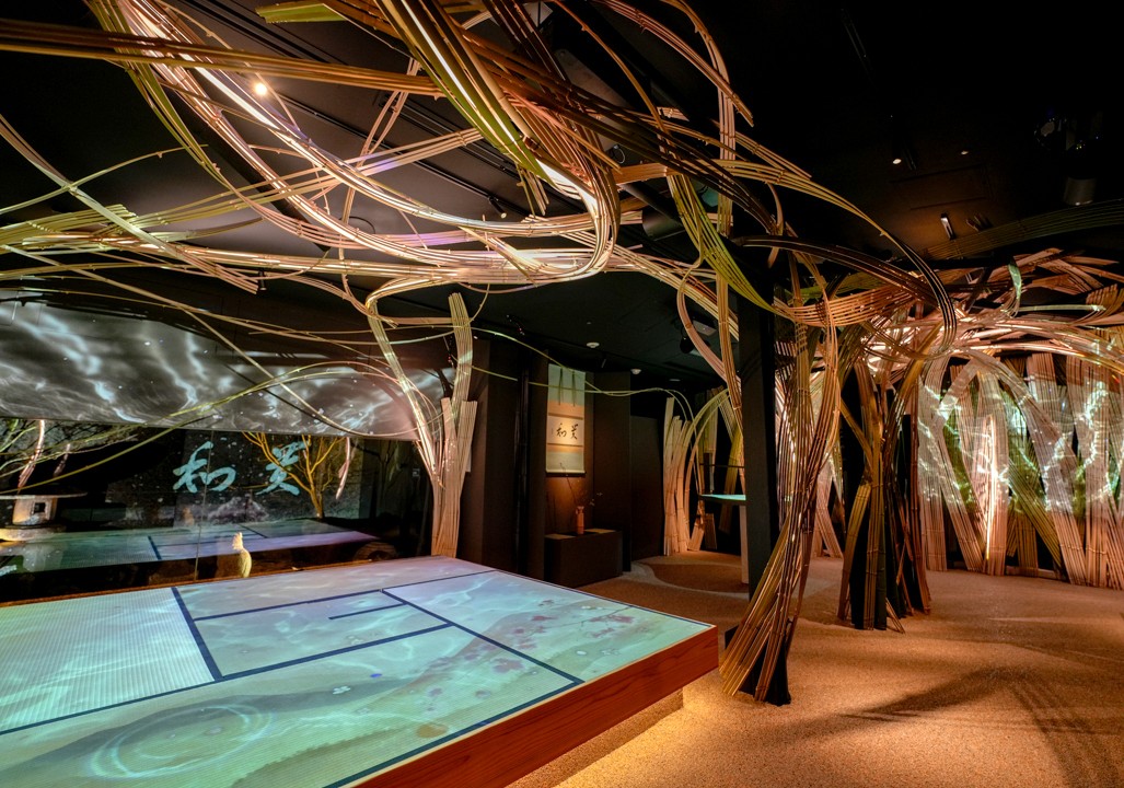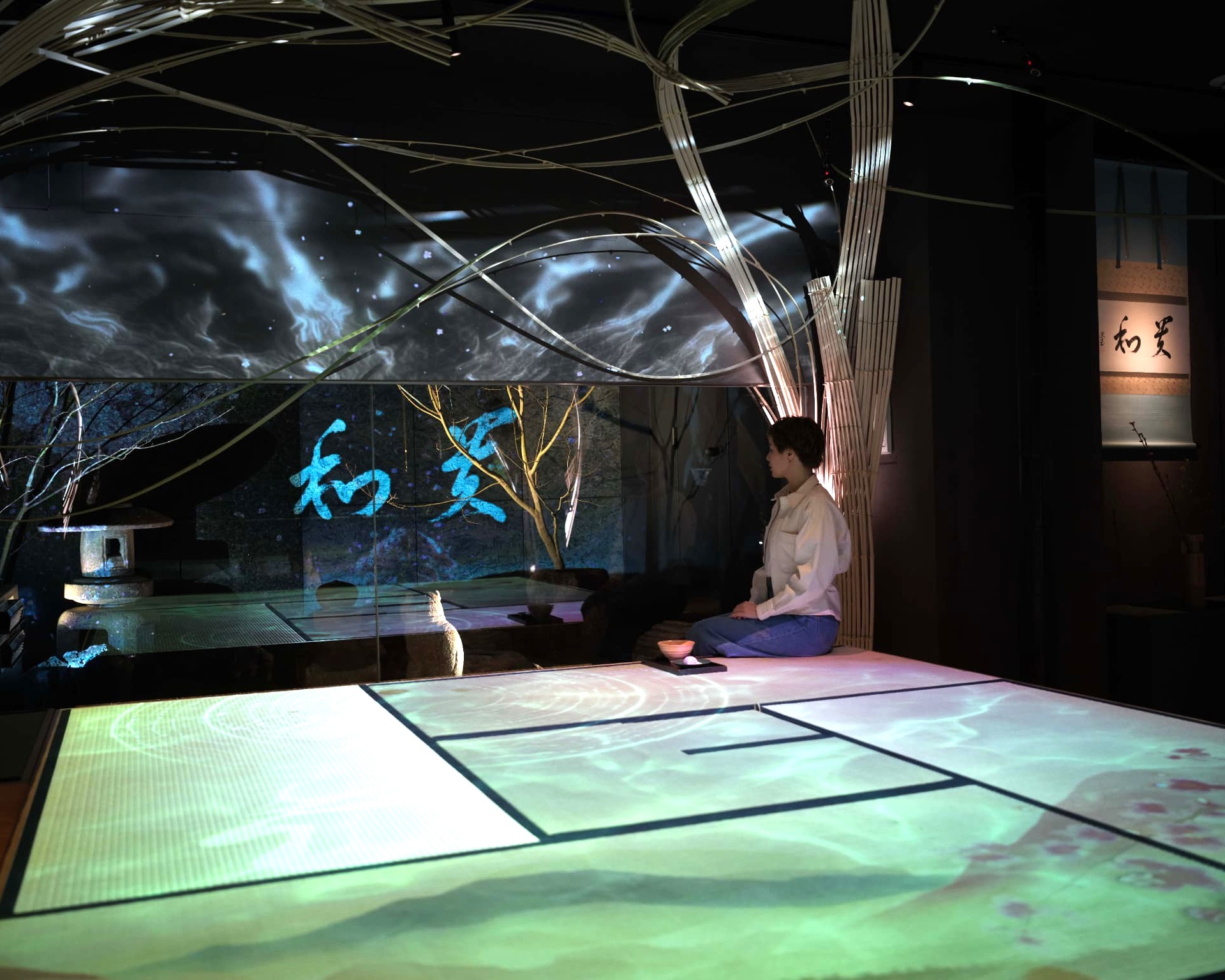 また、体験者限定で(抹茶和菓子セットご注文いただいた方)、マッピングされた畳の間に広がる映像演出の中でゆったりと抹茶を味わえます。
