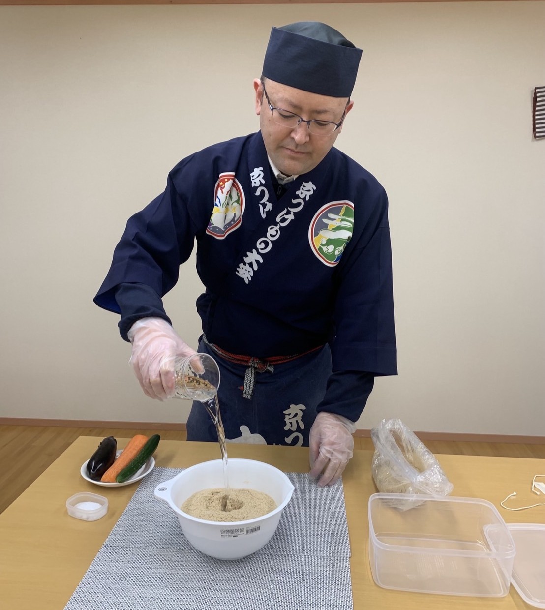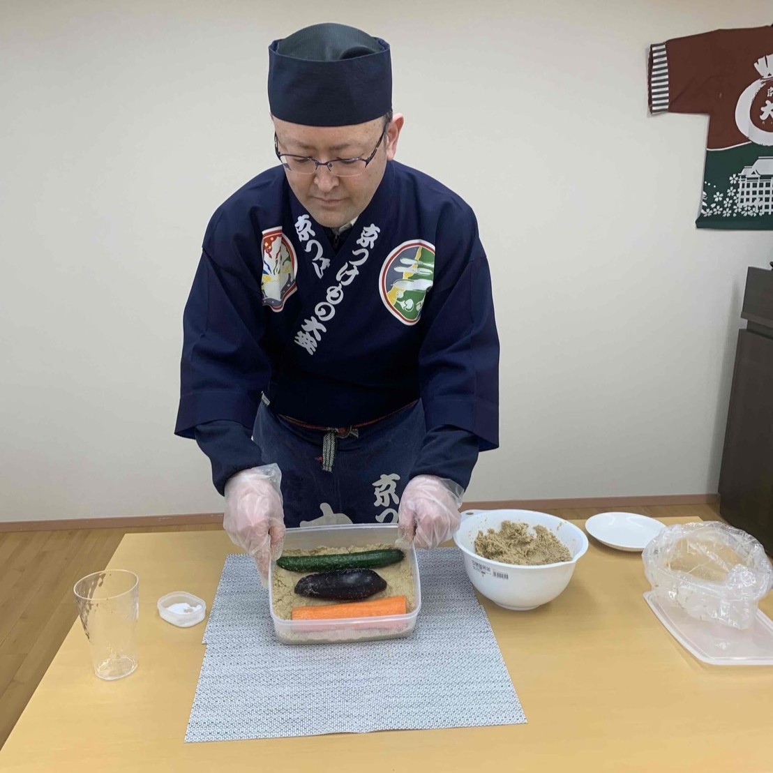 参加者は実際に野菜をぬか床に漬け込み、自分だけのぬか漬けを作る体験ができます。保存容器を使用しますので、出来上がったぬか漬けをお土産として持ち帰っていただけます。