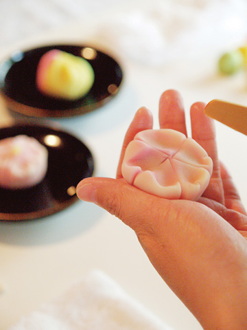 京情緒あふれる町家で、ベテラン職人の指導による京菓子作りを体験。職人の実演を見学した後、京菓子を3個作ります。1個は抹茶とともに座敷でいただき、残りはおみやげに。抹茶は自分でたてることもできます。