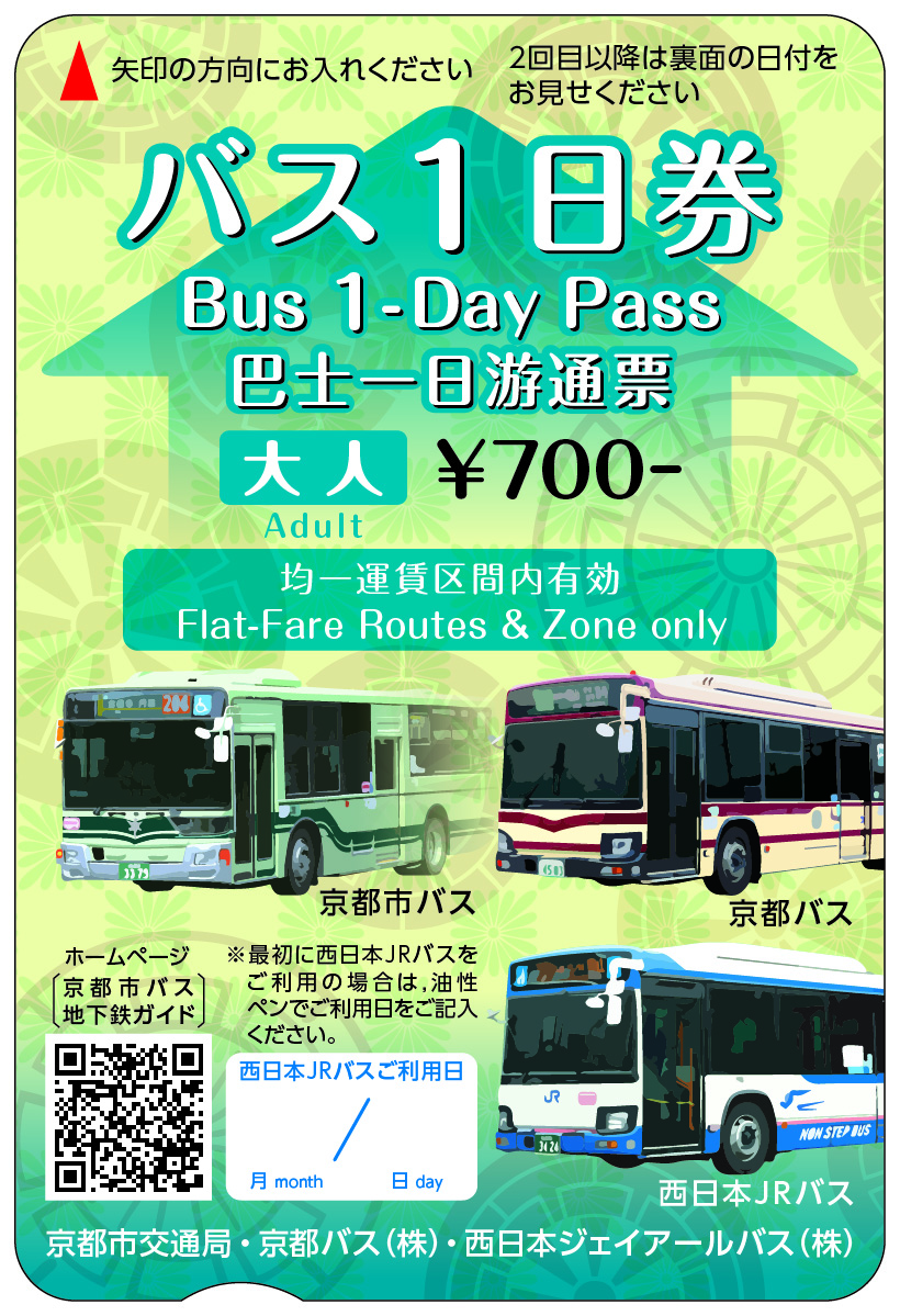 市バス・地下鉄全線と京都バス(一部区間を除く)、さらに京阪バス(一部区間を除く)において1日に何度でも乗り降りできる乗車券です。修学旅行のみで使え、多彩な優待内容を満載した「京都修学旅行パスポート」としても使えるほか、主要路線ガイドマップも付いています。